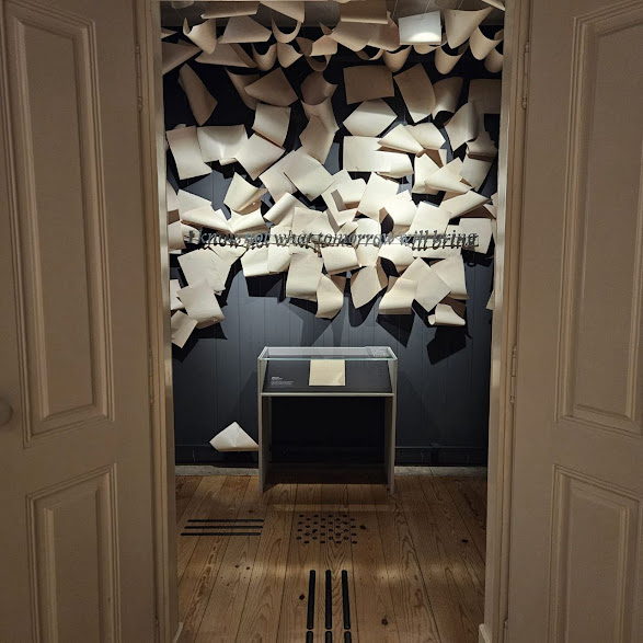 Lá, podemos conhecer mais sobre Fernando Pessoa e seus heterônimos: a história deles, suas poesias e biografias. São 3 heterônimos: Alberto Caeiro, Álvaro de Campos e Ricardo Reis, todos com características próprias que os distinguem uns dos outros e do próprio Fernando Pessoa. Lá, aprendi que os heterônimos propriamente ditos são apenas estes 3 pois possuem uma biografia completa, com local, data de nascimento e morte, e os outros (que também são citados e explicados) são criações de Fernando Pessoa, mas não chegam a ser completamente heterônimos por não possuírem biografia completa. Eu não fazia a mínima ideia dessa informação, pois ela não é difundida, e achei bastante interessante. Nesse andar também se encontra quadros de Fernando Pessoa e a sua máquina de escrever, além de um espaço com espelhos em todas as direções, em que possível ver vários "vocês" e, em uma parede, a indagação: "Quantos sou?". Além disso, há poltronas com headphones ligados a uma tela (parecida com um tablet) apoiada nas poltronas, contendo textos de Fernando Pessoa e de seus heterônimos, para você poder ler e ouvir. Achei muito massa! Eu escutei e li um texto do próprio Pessoa sobre seus heterônimos e os belíssimos poemas "Apontamento" (que já conhecia e gostava), de Álvaro de Campos, e "Quando eu não te tinha", que eu ainda não conhecia e de autoria de Alberto Caeiro.